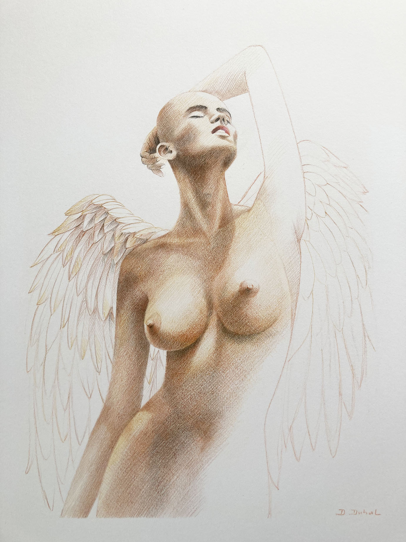 VENDU - NU D’APRÈS UNE PHOTO DE Jacques ATTALI - Crayon blanc sur papier noir - 29 x 39 cm